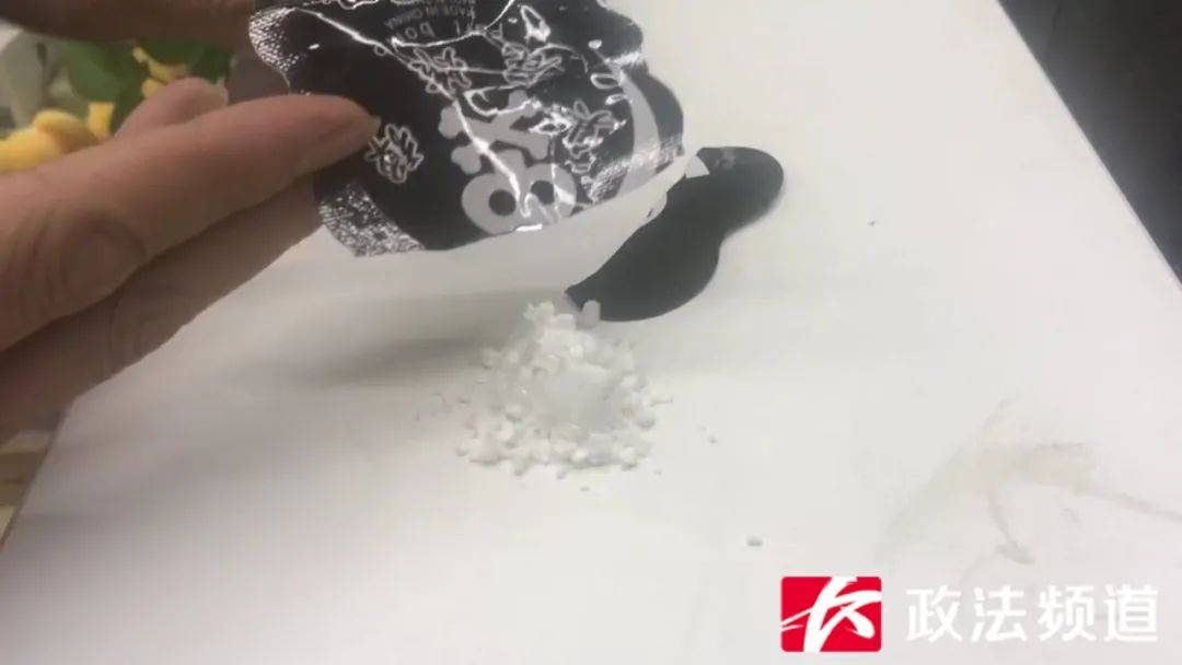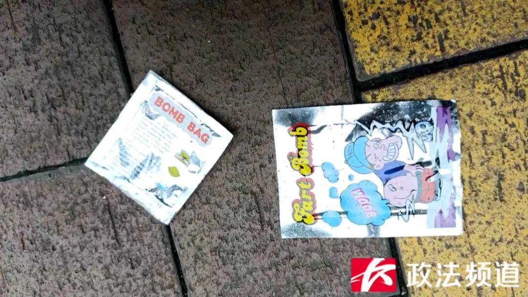 本来,“臭屁炸弹”包装袋内有少数白色粉末,加一个塑料气囊,气囊中有不明通明液体。白色粉末并无异味,但气囊决裂后,液体渗出与白色粉末产生化学反应后,浓郁的冲鼻异味就此产生了。